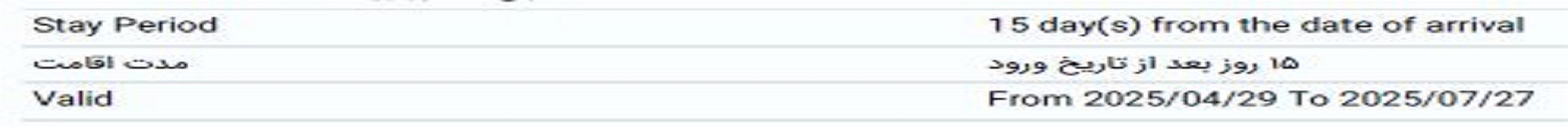 اعتباراً من تاريخ 2025/04/30 ، مدة صلاحية (Validity)تأشيرات الدخول الصادرة إلى الجمهورية الإسلامية الإيرانية 45 يوماً (بإستثناء التاشیرات المتعددة الدخول).