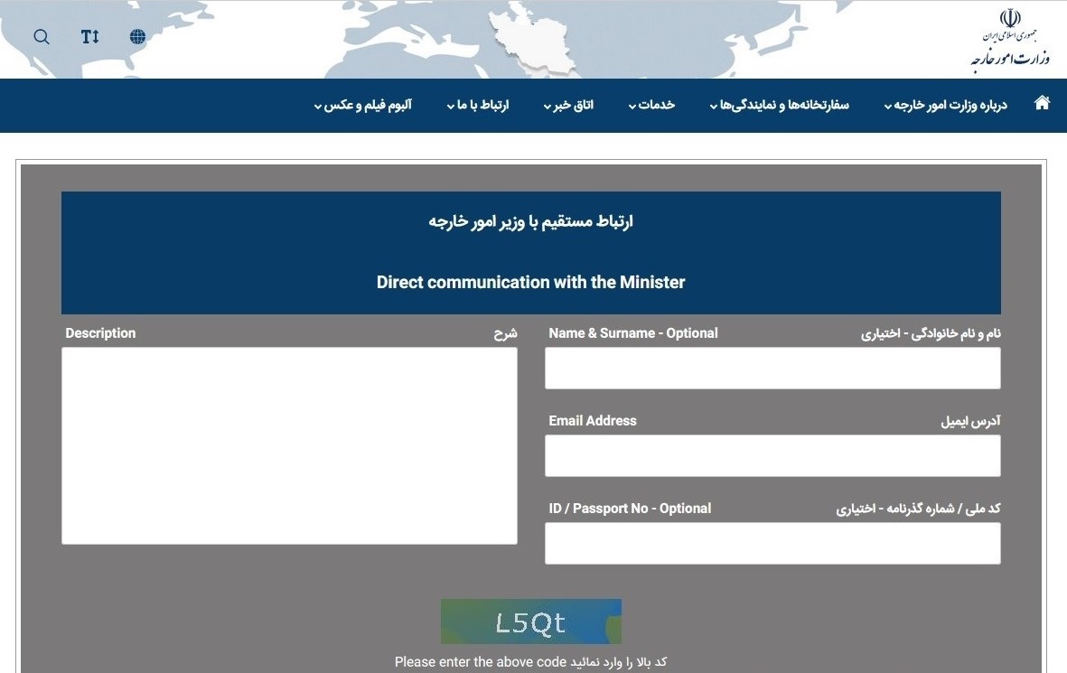 به اطلاع میرساند بهمنظور برقراری ارتباط آسان و بیواسطه هموطنان ایرانی مقیم خارج از کشور با وزیر محترم امورخارجه، «سامانه ارتباط مستقیم با وزیر امورخارجه» به نشانی https://mfa.ir/portal/regquestions جهت درج نقطهنظرات و دیدگاهها راهاندازی شد.
